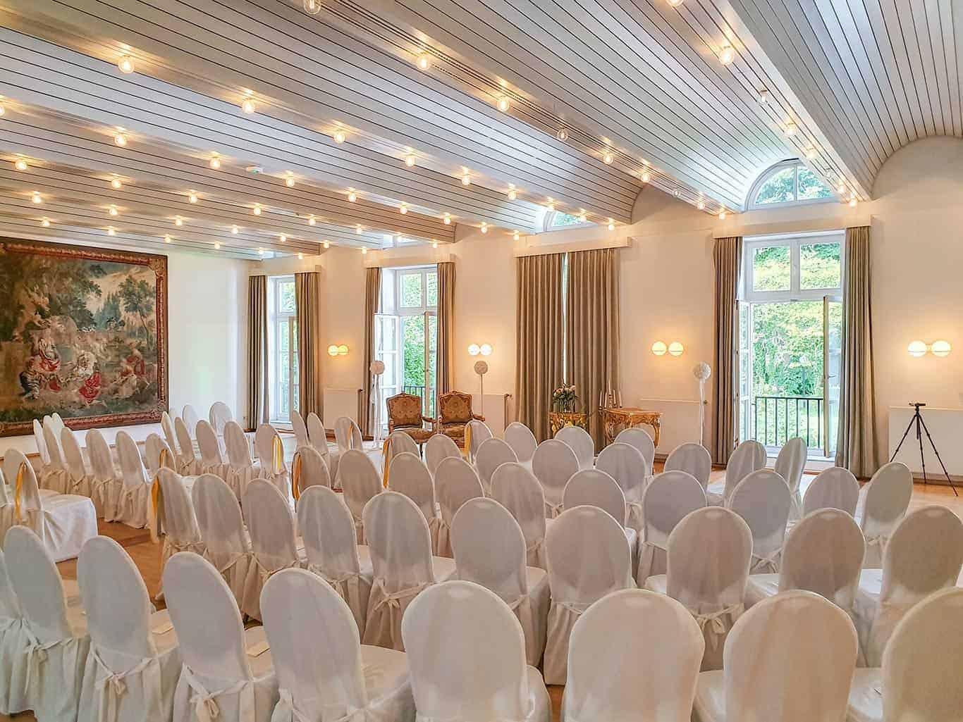 Für kleinere, intimere Feiern bieten das Gartenzimmer und das Medaillonzimmer den idealen Rahmen. Das Gartenzimmer, direkt an der Südterrasse mit herrlichem Ausblick auf den Schlosspark, bietet Platz für 25 bis 40 Gäste. Unser Medaillonzimmer – unser kleines Schmuckstück – schafft mit Platz für 10 bis 15 Personen eine besonders exklusive Atmosphäre.